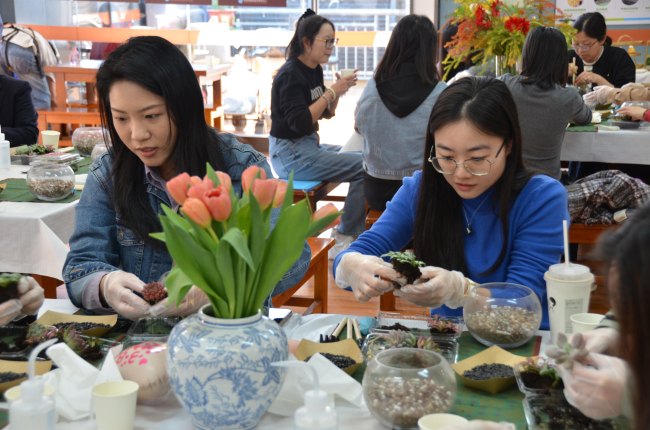 活动开始,女职工们纷纷拿起玻璃容器、苔藓、多肉、迷你摆件等材料动手创作,以容器为纸、以绿植为墨